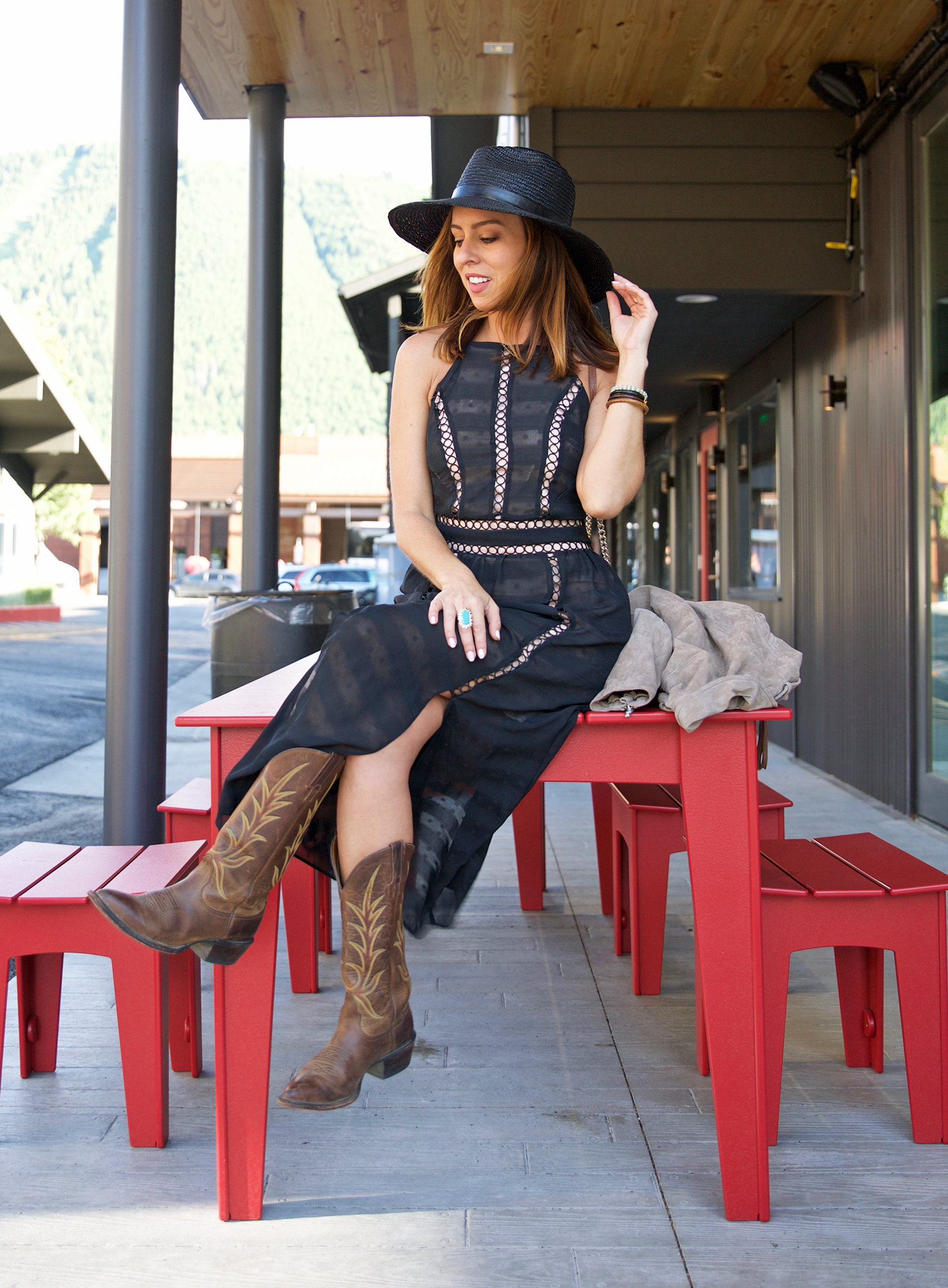 Adding a touch of style to your cowboy boot ensemble is the key. Regardless of whether you pair it with a ladylike dress or a moto jacket. I added an extra Western touch with a double buckle belt and turquoise jewellery since I was in Wyoming.