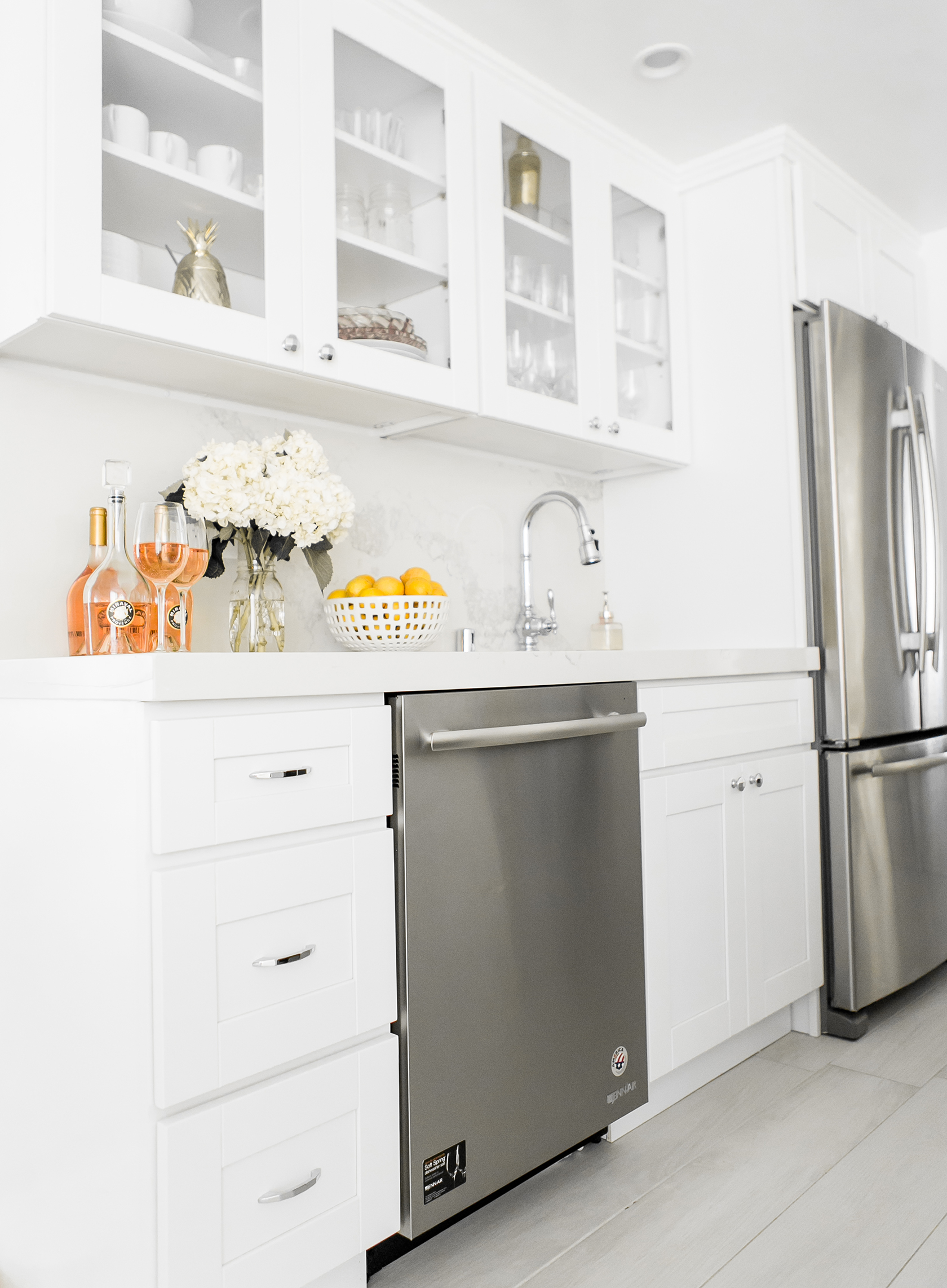 Sydne Style shares white kitchen remodel with glass cabinets