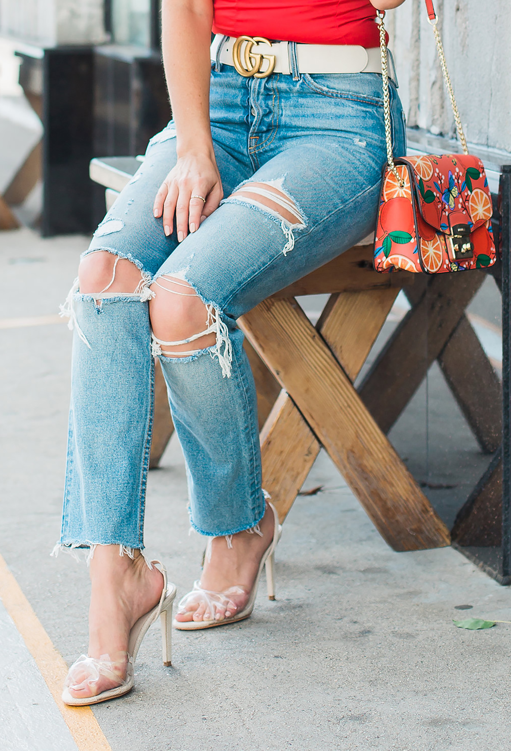 The shoulder detail and satin feel instantly dresses up a pair of jeans. I went extra summery with my fruit bag and a matching red lip. If one-shoulders aren’t your thing, I rounded up some other fun camisoles below…