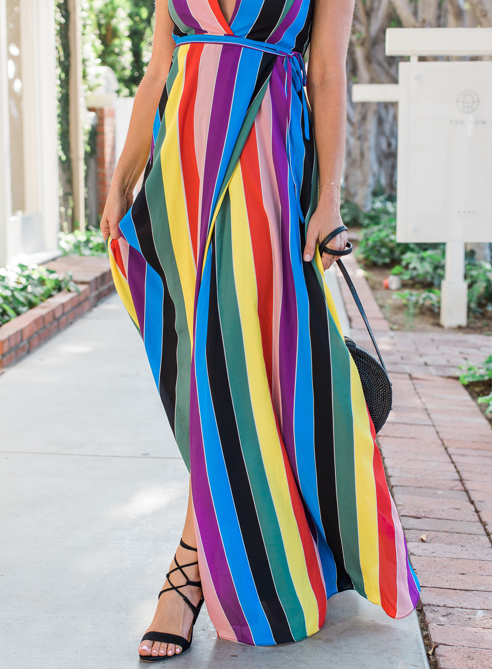It’s amazing what bright colors do for your mood. The minute I slipped into the vibrant striped maxi dress, I couldn’t help but smile. I paired my dress with a black straw bag and lace up sandals for a bold summer night. But the beauty of the rainbow trend is you can wear it year round. I could totally see some of the dresses below with booties and a leather jacket come fall. Because shouldn’t we all feel bright year round?