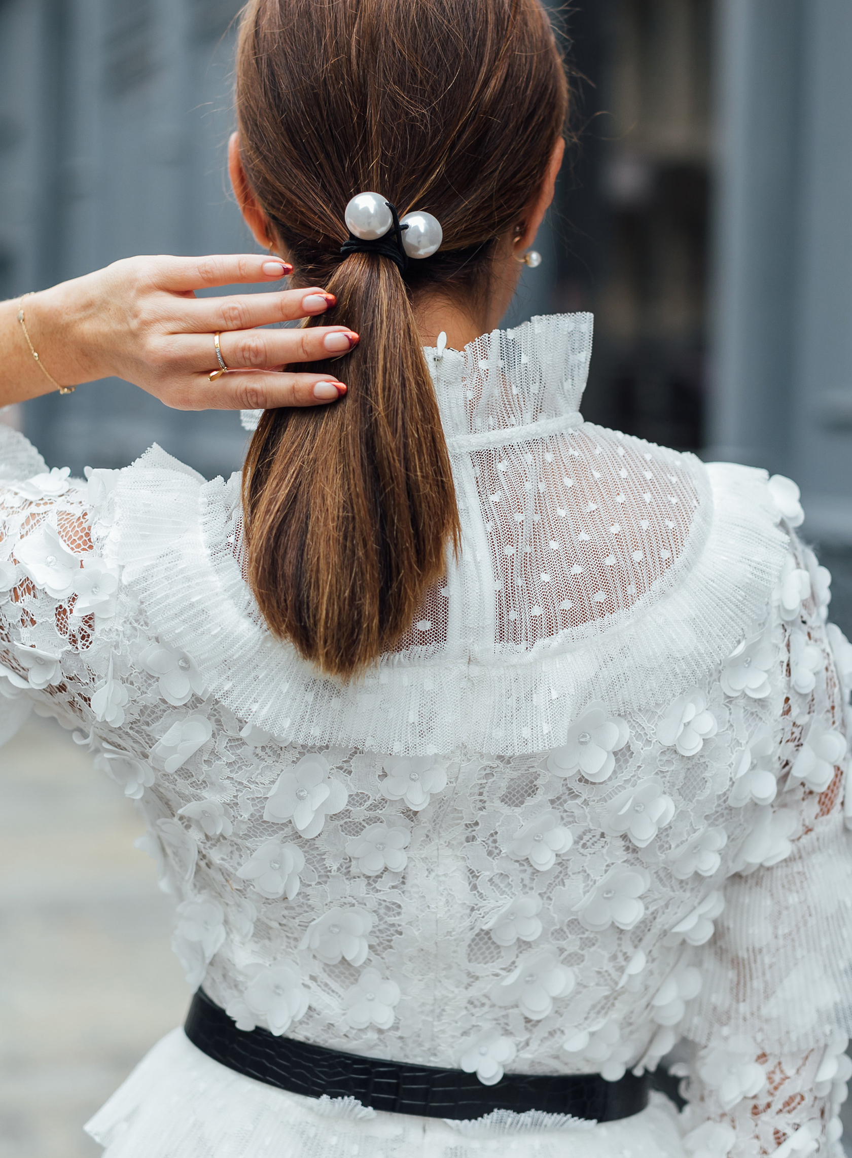 Black booties are an easy way to make white dresses look fall ready. My lucite sock booties are now on sale! I also added a black bracelet clutch, which will be available next month. Since my dress had a bit of a Victorian vibe with high collar, I decided to accent with pearl accessories. My favorite was a pearl ponytail holder. It made getting ready at fashion week so easy!