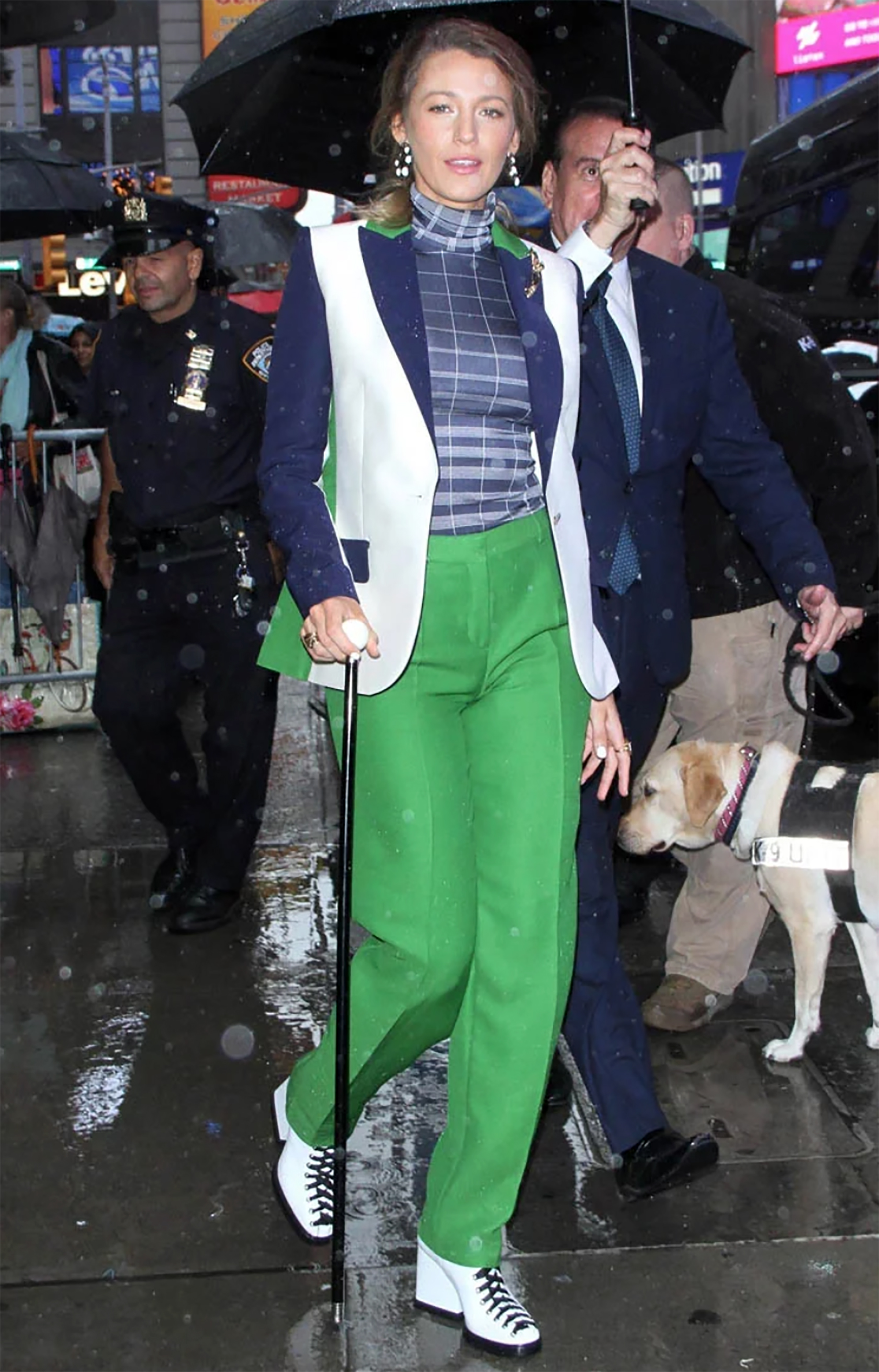I took the emerald pants I wore in the beginning of fashion week and instead of pairing them with the matching top, I added a blue silk top. That’s what is so great about separates. There are endless styling possibilities!