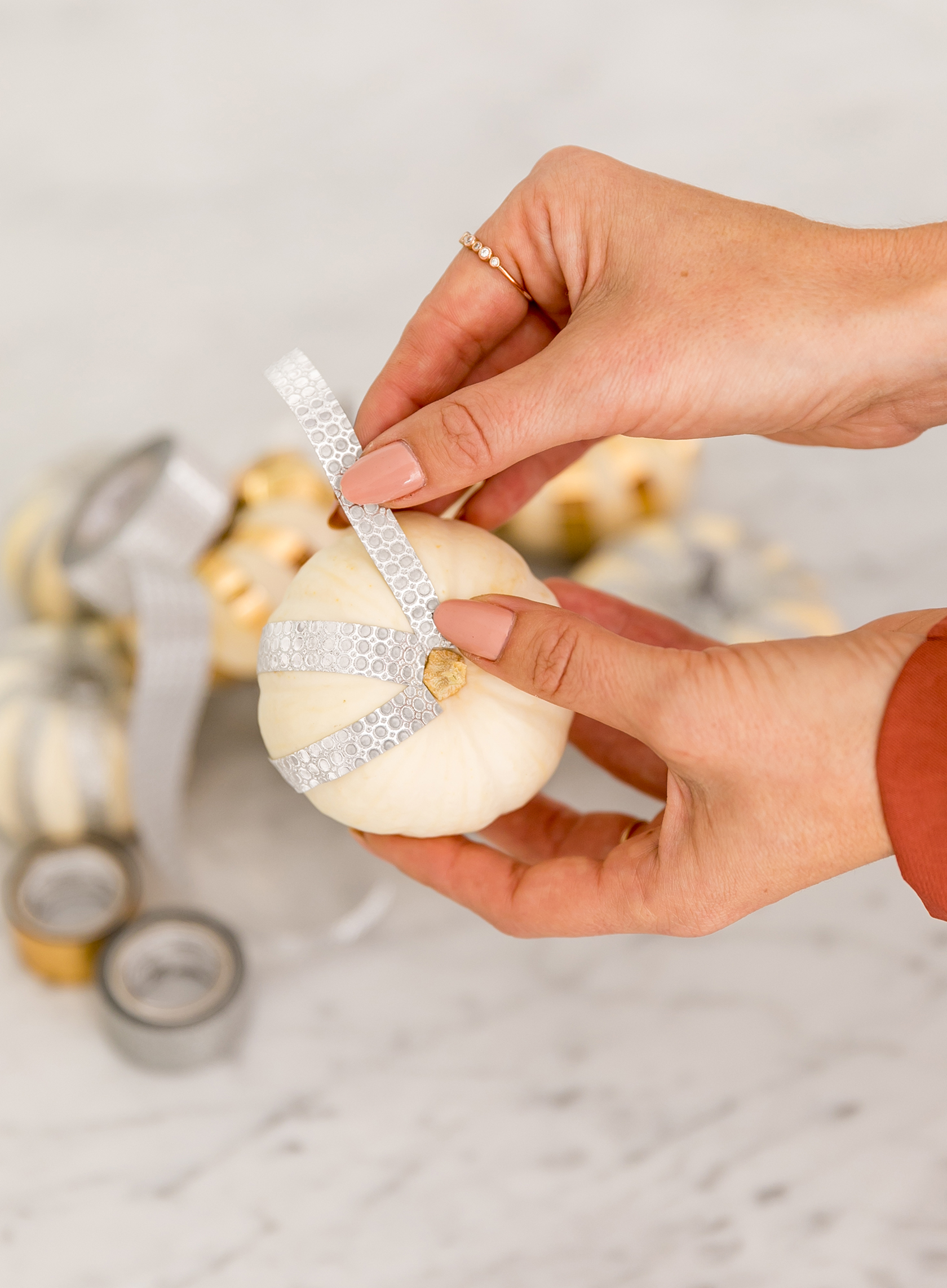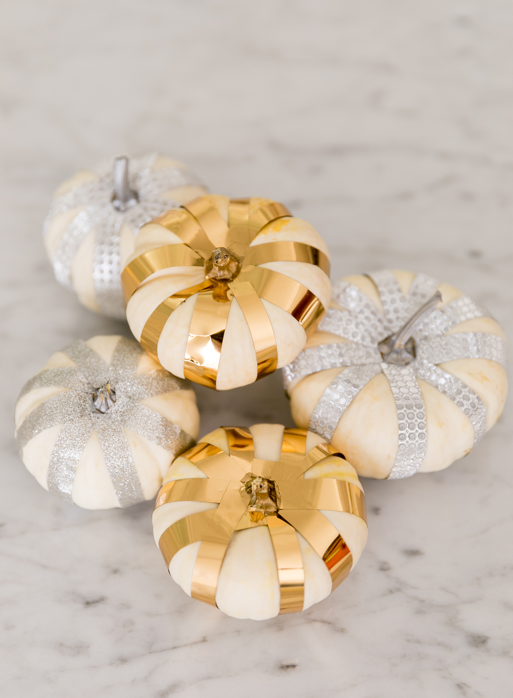 I found my mini white pumpkins for about 60 cents at Trader Joe’s. Most grocery stores have them this time of year and it’s much easier to buy them then paint them white! Since my home has a mixed metallics theme, I did a mixture of gold mirror, silver glitter and silver dot crafting tape. But you can go with whatever color you prefer (they have endless options!).