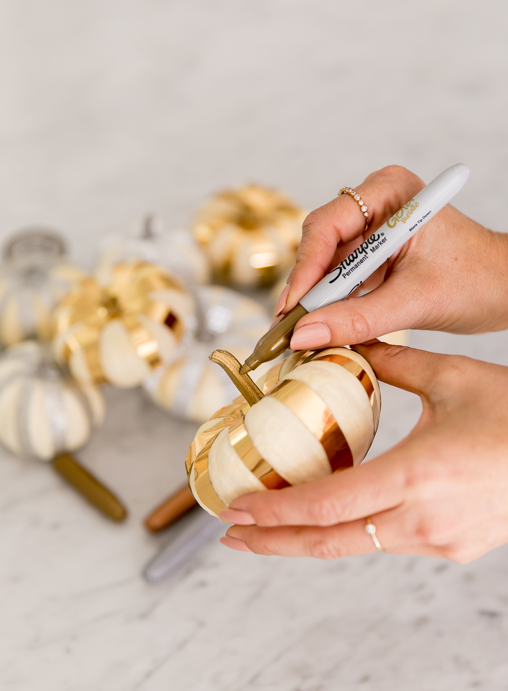 To make the pumpkins, you simply cut the tape in half, and wrap it around each crease of the pumpkin. Then you can use a metallic marker to have the stem of the pumpkin match the stripes. I bought a pack of metallic Sharpies since they had both gold and silver.