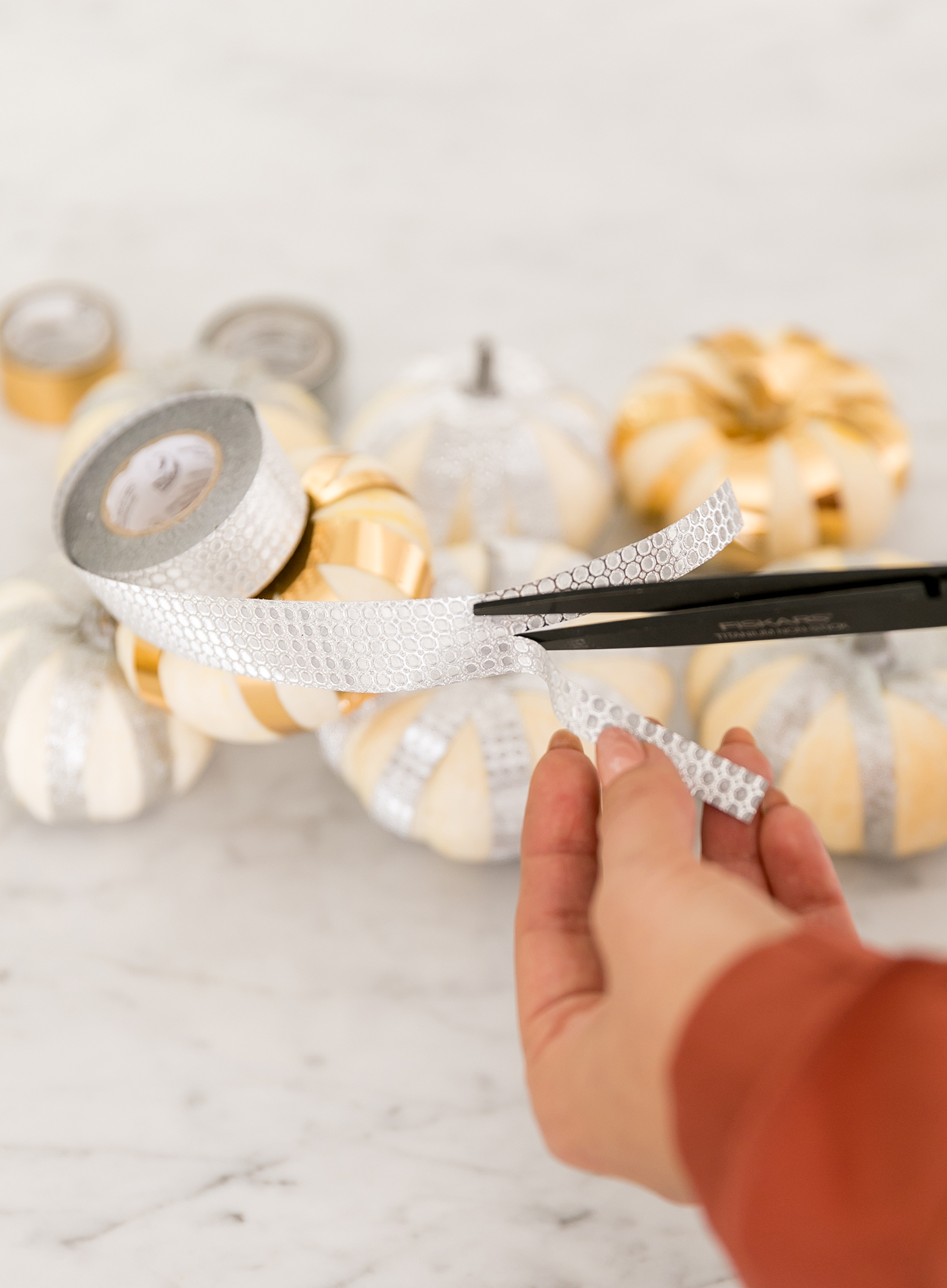 After seeing such beautiful Fall decor inspiration on Pinterest, I decided to DIY my own metallic stripe pumpkins. With a mostly white home, I didn’t want to bring in messy paint or glitter for a night of crafting. So I went with easy, no-mess tape. To create these metallic stripe pumpkins, you only need four materials. They take very little time, create no mess and you can use them to spruce up all different parts of your home for Fall!