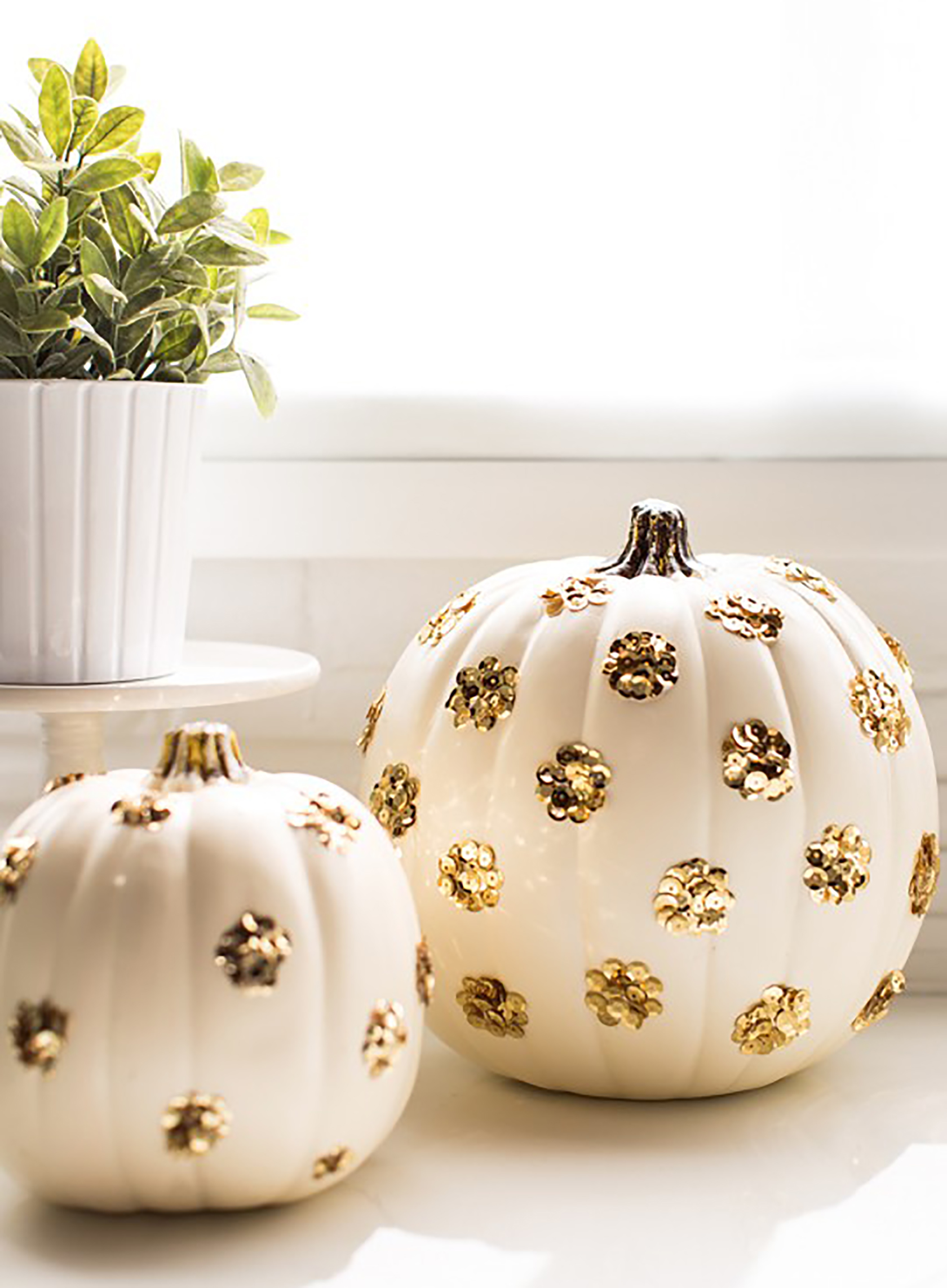 Another no-mess idea is Anum Tariq‘s mini black and white pumpkins with mini gold dots. I’m guessing she just did this with a metallic paint pen. I also love the gold confetti pumpkin DIY from Homey Oh My.