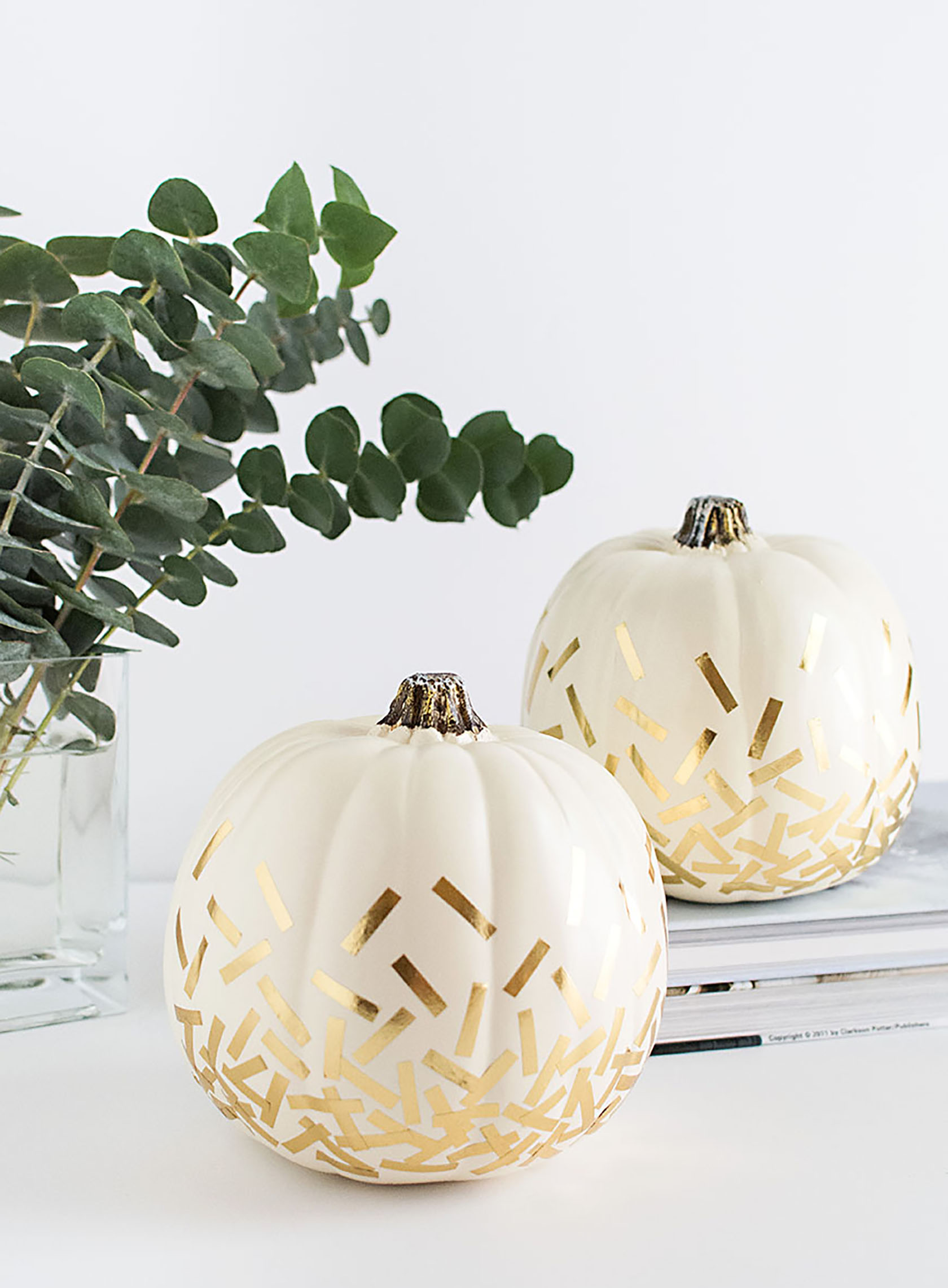 Another no-mess idea is Anum Tariq‘s mini black and white pumpkins with mini gold dots. I’m guessing she just did this with a metallic paint pen. I also love the gold confetti pumpkin DIY from Homey Oh My.